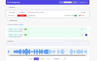 ライブミーティングノートは、ノート取りと会議の要約の効率を向上させるために設計された強力なツールです。このアプリケーションはChrome内で直接動作し、専門家向けに調整されたさまざまな機能を提供します。主な機能には、高品質の音声録音、Gemini AIによるリアルタイムの音声からテキストへの変換、異なる言語での複数の話者を認識する能力が含まれます。ユーザーは、自動タイムスタンプラベリングや音声シーク機能を利用して、録音を簡単にナビゲートすることもできます。